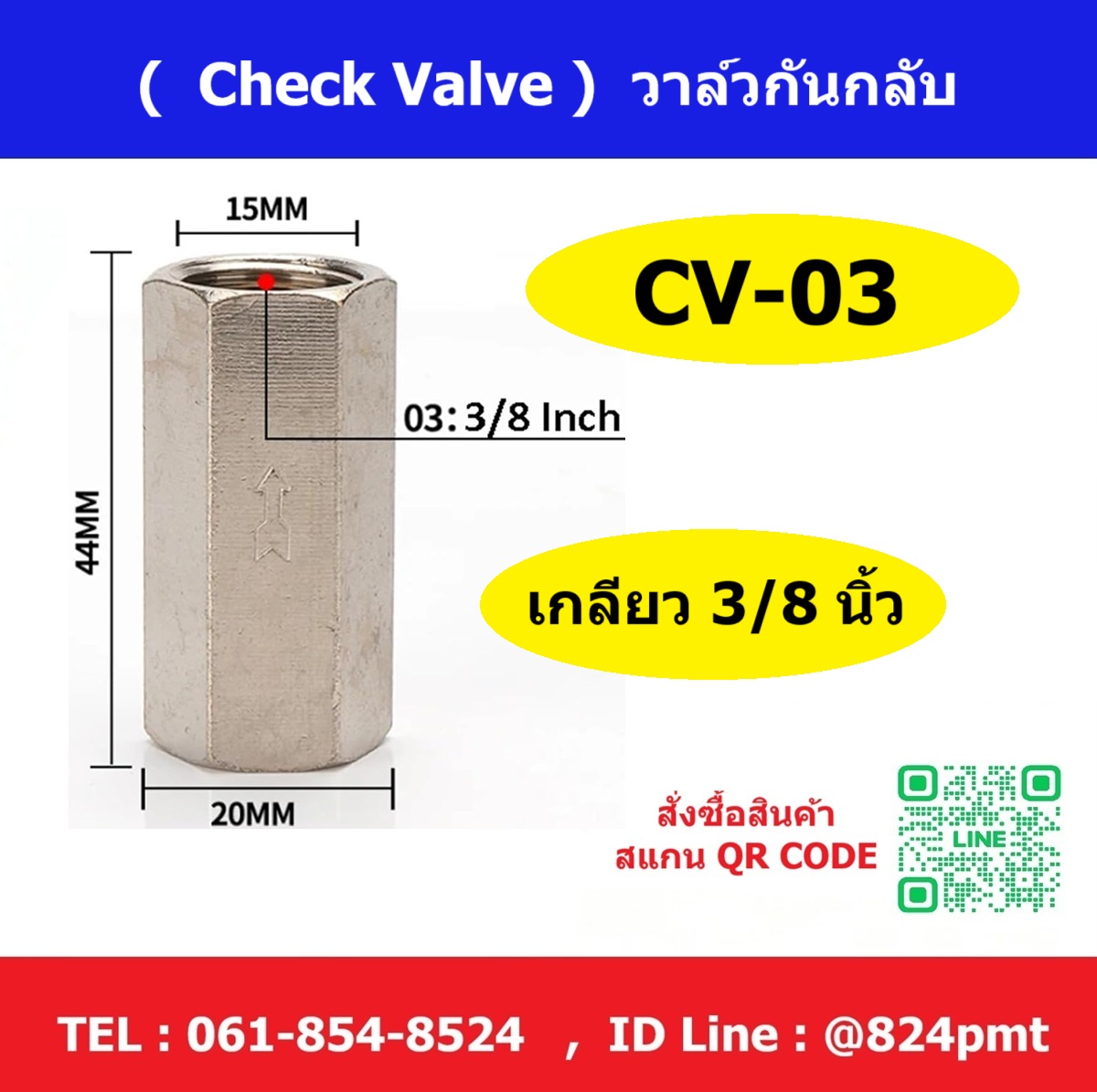 รุ่น CV-03: หมายถึง เช็ควาล์ว ขนาด 3 หุน (3/8 นิ้ว) ซึ่งเป็นขนาดของเกลียวหรือพอร์ตสำหรับเชื่อมต่อกับท่อลม