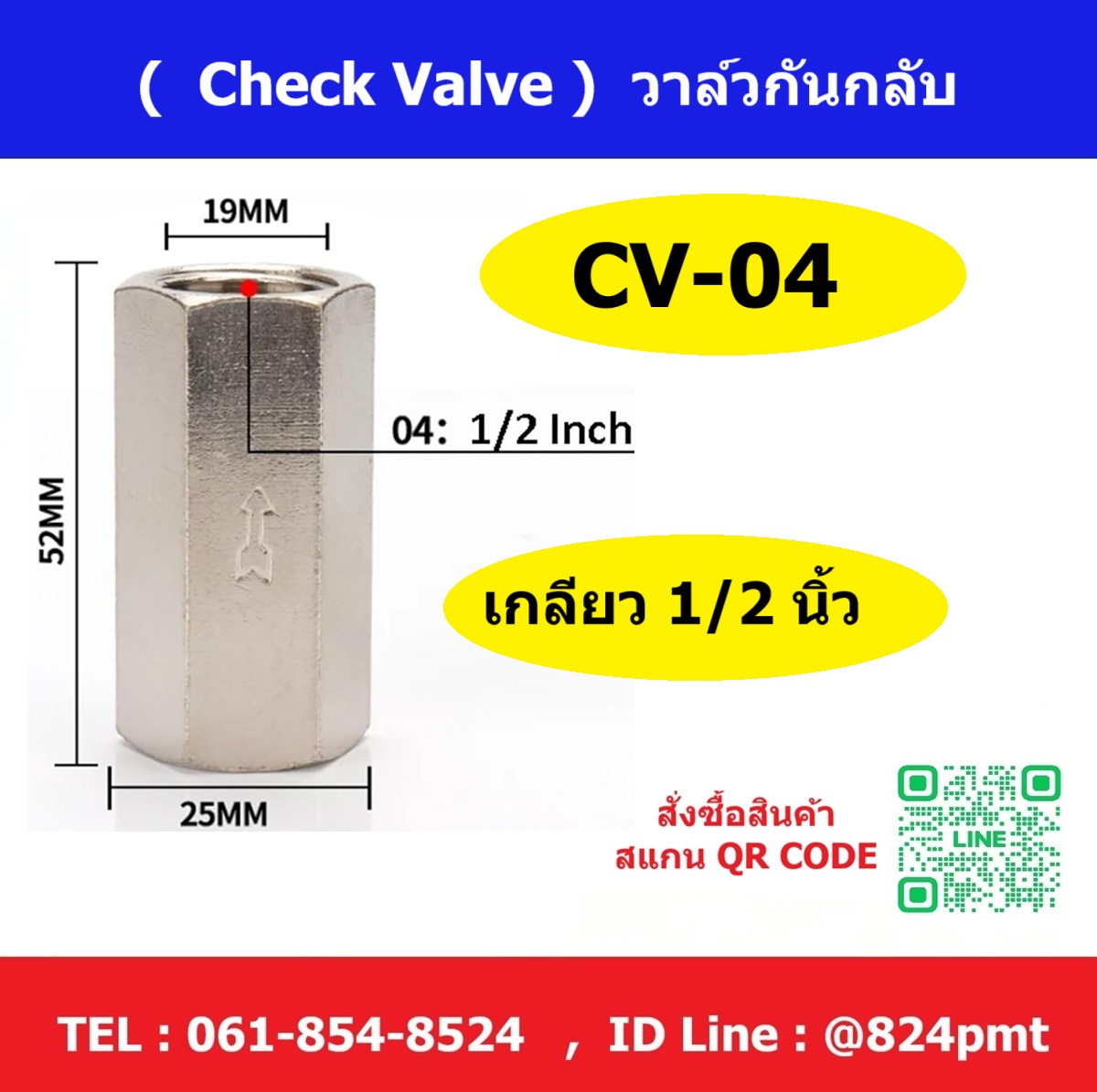 รุ่น CV-04: หมายถึง เช็ควาล์ว ขนาด 4 หุน (1/2 นิ้ว) ซึ่งเป็นขนาดของเกลียวหรือพอร์ตสำหรับเชื่อมต่อกับท่อลม