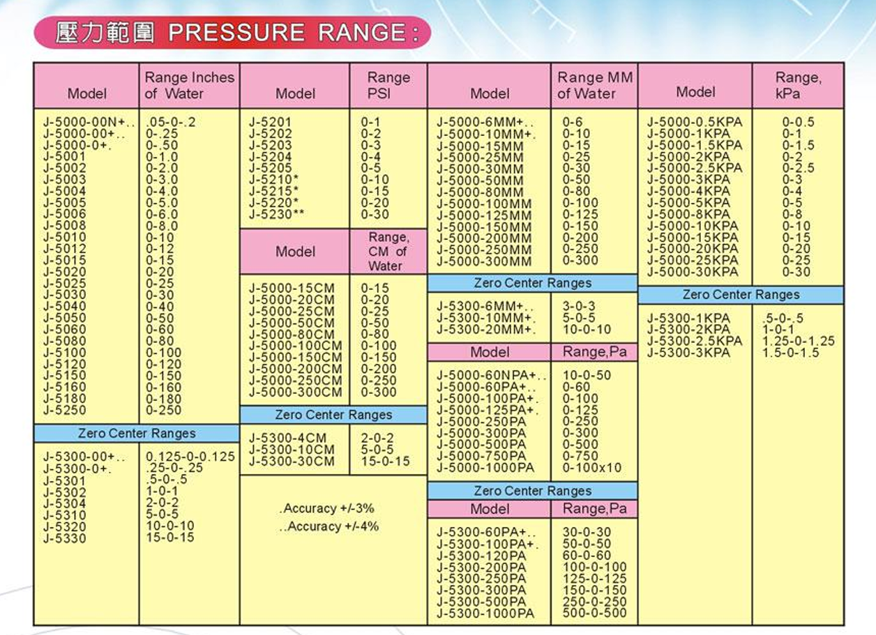 Inches of Water,inH2O,mmH2O,mm of Water,cm of Water,CM inH2O,Kpa,Pa,Psi