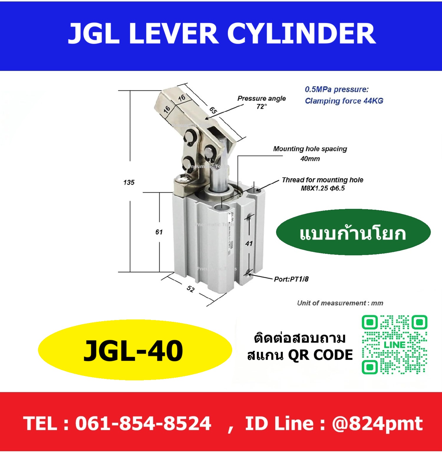 JGL40: เส้นผ่านศูนย์กลาง 40 มม. แรงหนีบประมาณ 44 kgf มุมเปิด 72°
